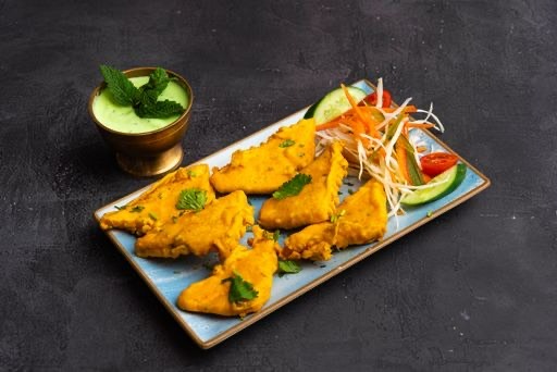 Kawałki kurczaka w panierce z mąki z ciecierzycy, smażone na głębokim oleju.