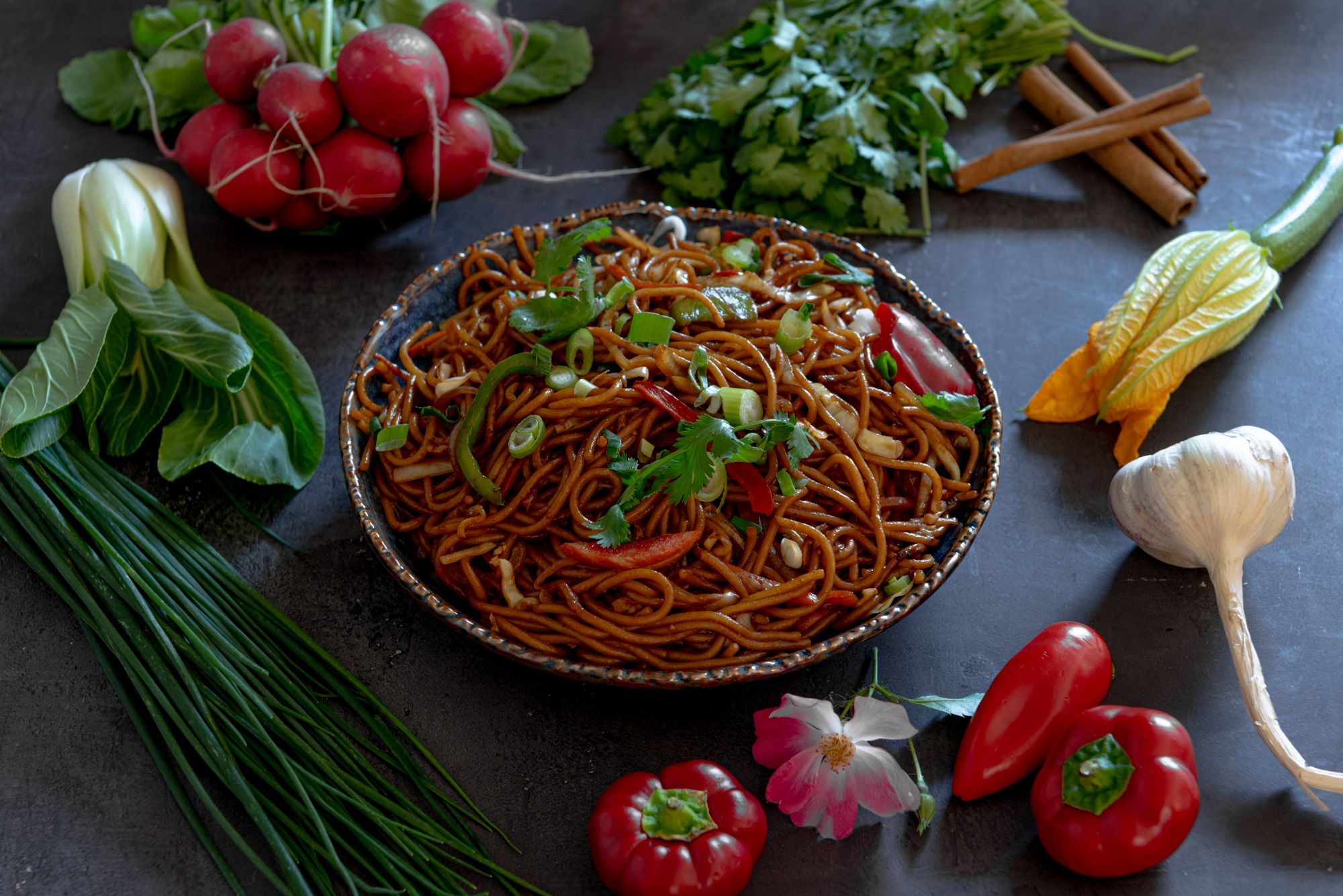 Makaron gotowany z warzywami, kurczakiem lub krewetkami, w nepalskich ziołach.