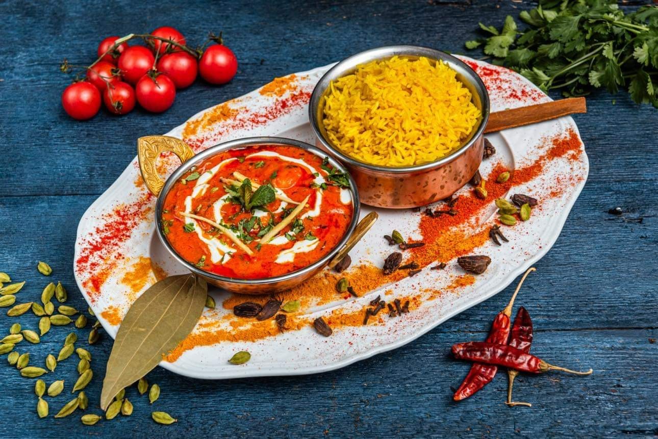 Mała porcja Butter Chicken z ryżem lub chlebkiem Naan.