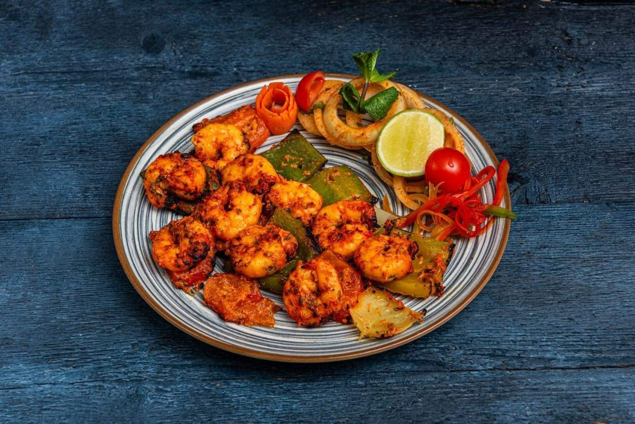 Krewetki tygrysie marynowane w jogurcie i indyjskich ziołach, grillowane w piecu tandoor.